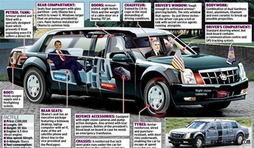 這輛車其實(shí)是在中型卡車的基礎(chǔ)上打造而成的。整車采用了被視為美國(guó)國(guó)家機(jī)密的雙重厚度高密度鋼板、鈦鋼合金和高強(qiáng)度陶瓷,以抵抗各種武器的襲擊,具有防彈功能的車門達(dá)8英寸厚,重量相當(dāng)于波音757的艙門。