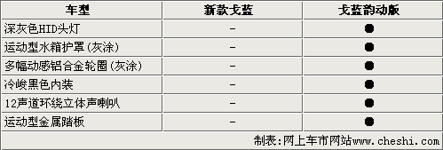 新款戈藍還增加了戈藍韻動版車型,這款新車在整車的設(shè)計方面都有新的變化。在外觀方面,戈藍韻動版采用深灰色HID大燈、運動型灰色涂裝水箱護罩以及多幅動感鋁合金輪轂。內(nèi)飾方面采用了黑色內(nèi)飾風(fēng)格,配備了12聲道環(huán)繞立體聲喇叭和運動型金屬踏板,使整車看上去更具運動氣質(zhì)。