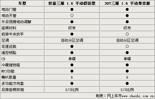 由于兩款車型都是1.6的高配車型,多以在配置方面比較全面。電動門窗、外后鏡電動調(diào)節(jié)、遙控鑰匙和后排座椅放倒功能都是它們的標配。不僅這樣,它們還配備了一些中高級轎車才配備的冷藏功能手套箱和自動雙區(qū)空調(diào)。但是仔細看下來各兩款車型還是各自都有各自的特點,雪鐵龍世嘉三廂配備了定速巡航,可以大大減少駕駛員長途駕駛的疲勞。標致307則配備了電動天窗。在音響方面,307的8揚聲器可以讓乘客更好的體會到音樂的樂趣。兩款車型都配備了方向盤音響調(diào)節(jié)功能。
