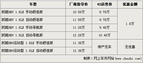 據(jù)經(jīng)銷商處銷售人員介紹,凱越HRV共有6個(gè)車型,由于運(yùn)動(dòng)版車型現(xiàn)已停產(chǎn),經(jīng)銷店內(nèi)已經(jīng)沒有現(xiàn)車,所以在售的車型只有舒適版和導(dǎo)航版共4款車型。近期購買凱越HRV的消費(fèi)者可以得到1.8萬元的現(xiàn)金優(yōu)惠,經(jīng)優(yōu)惠后,入門級的1.6LE 手動(dòng)舒適版車型售價(jià)從廠商指導(dǎo)價(jià)10.58萬元跌至8.78萬元。