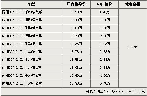 據(jù)東風(fēng)標(biāo)致經(jīng)銷店銷售人員介紹,兩廂標(biāo)致307分為1.6L和2.0L兩種排量,目前優(yōu)惠1.2萬元,入門車型的1.6L 手動(dòng)精致版原廠商指導(dǎo)價(jià)為10.98萬元,經(jīng)優(yōu)惠后僅售9.78萬元,排量稍大的2.0L排量的低配車型手動(dòng)精致版經(jīng)優(yōu)惠后售價(jià)為11.08萬元,F(xiàn)車方面,1.6L車型現(xiàn)車充足,2.0L車型則現(xiàn)車緊張,挑選空間不大。