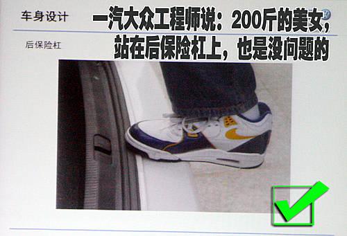 一汽大眾產品部工程師這樣說:“即便一個200斤美女站在我們產品的的后保險杠上,那也是沒有問題的”。雖然我們身邊很少有人去嘗試站在保險杠上,但是這樣的設計都源自大眾的嚴謹態(tài)度,在很多時候您的愛車完全可以當作一架小梯子去使用。