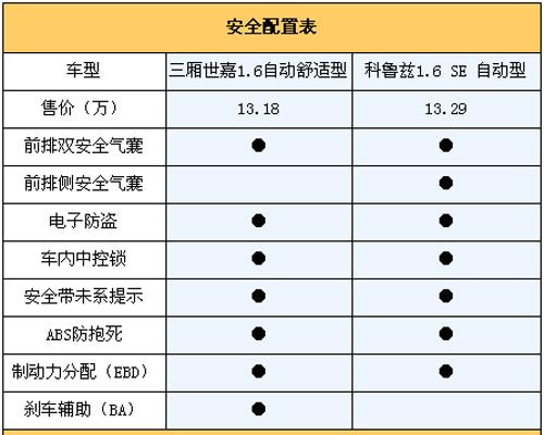 從上面表中我們看出,科魯茲在被動(dòng)安全配備上更出色,除了正面雙氣囊外還配備了側(cè)面安全氣囊,當(dāng)車輛發(fā)生側(cè)面碰撞時(shí)對(duì)駕乘者的保護(hù)要更到位。相比之下三廂世嘉只在更高的豪華型中配備了側(cè)氣囊,不過三廂世嘉的主動(dòng)安全方面卻比較完備,ABS+EBD+BA的組合完全可以應(yīng)付日常緊急情況,而科魯茲相對(duì)來(lái)說(shuō)就有些單薄,甚至在當(dāng)前經(jīng)濟(jì)型轎車都要配備剎車輔助系統(tǒng)的情形下,這項(xiàng)配備的缺失不能不說(shuō)是一種遺憾!