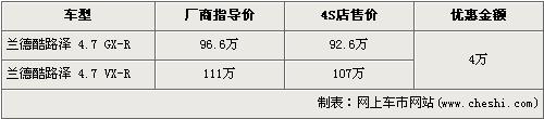據(jù)經(jīng)銷商銷售人員介紹,豐田-蘭德酷路澤分為4.0L和4.7L兩種排量,由于4.0L車型的尾氣排放是歐III標(biāo)準(zhǔn),沒(méi)有達(dá)到北京施行的歐IV標(biāo)準(zhǔn),所以北京限賣,店內(nèi)沒(méi)有4.0L車型。4.7L車型分為GX-R版和VX-R版,目前購(gòu)買蘭德酷路澤的消費(fèi)者可以得到4萬(wàn)元的優(yōu)惠。經(jīng)優(yōu)惠后,GX-R版售價(jià)降為了92.6萬(wàn)元,VX-R版售價(jià)降到了107萬(wàn)元。銷售人員還介紹,店內(nèi)沒(méi)有蘭德酷路澤現(xiàn)車,預(yù)購(gòu)買者需交訂金1萬(wàn)元,約等一個(gè)半月可提車。