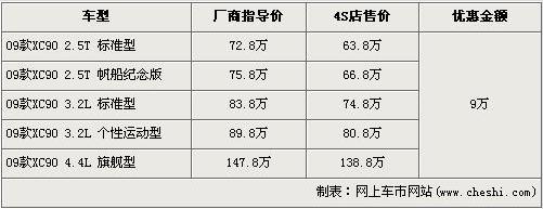 據(jù)沃爾沃經(jīng)銷商處銷售人員介紹,目前店內(nèi)的09款XC90車型全系都有9萬(wàn)元的現(xiàn)金優(yōu)惠,并且此次優(yōu)惠活動(dòng)截止到7月1日。經(jīng)優(yōu)惠后,2.5T標(biāo)準(zhǔn)型的售價(jià)跌破70萬(wàn)元,僅售63.8萬(wàn)元。2.5T 帆船紀(jì)念版經(jīng)9萬(wàn)元優(yōu)惠后,售價(jià)從75.8萬(wàn)元下降到了66.8萬(wàn)元。兩款3.2L排量車型經(jīng)優(yōu)惠后售價(jià)降為74.8萬(wàn)元及80.8萬(wàn)元,頂配的4.4L旗艦車型售價(jià)降為了138.8萬(wàn)元。銷售人員還介紹,XC90全系車型齊全,消費(fèi)者挑選的空間較大。