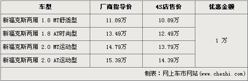 據(jù)長安福特經(jīng)銷商處銷售人員介紹,兩廂新款?怂谷祪(yōu)惠1萬元。兩廂新款福克斯分為1.8L和2.0L兩種排量,入門級車型的1.8L手動舒適版經(jīng)優(yōu)惠后,售價為10.89萬元。高配的2.0L自動運動版售價降到了14.39萬元。