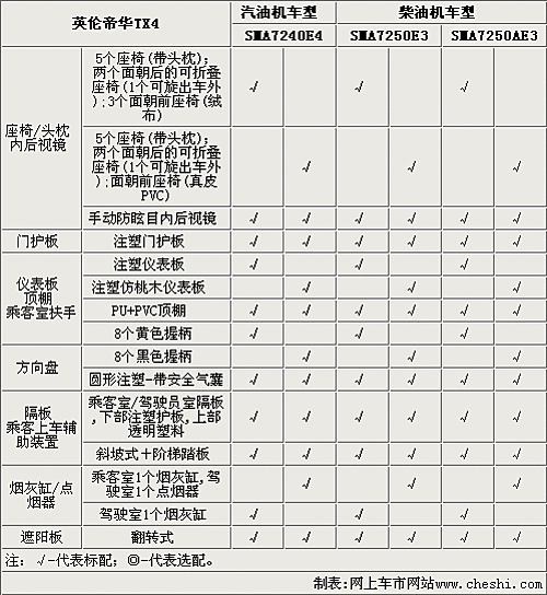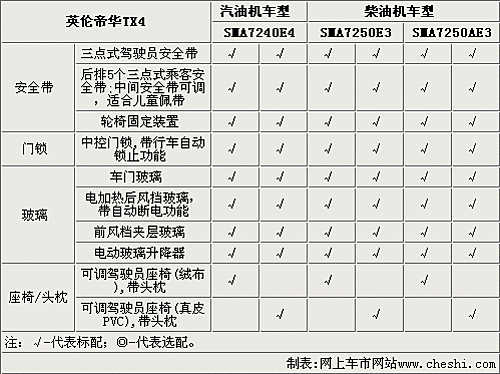 英倫TX4的后排帶有五個三點式安全帶,并且后排還帶有輪椅固定裝置。TX4配備了中控門鎖,帶行車自動鎖止功能,后風(fēng)擋玻璃也可以加熱,并且?guī)в凶詣訑嚯姽δ。TX4的高配車型都配備了真皮座椅,低配車型采用絨布材料座椅。