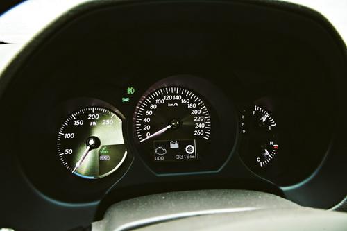 由于使用了電動(dòng)機(jī)系統(tǒng),GS450h的儀表盤并沒(méi)有設(shè)置發(fā)動(dòng)機(jī)轉(zhuǎn)速表,取而代之的一個(gè)功率表,隨時(shí)顯示電動(dòng)機(jī)的瞬時(shí)輸出功率;至于中間的車速表和右邊的綜合信息表在所有車型上則都是一樣的。GS系列車型儀表盤另一個(gè)特點(diǎn)就是具有ECD電子色控裝置,能夠根據(jù)照射在儀表盤上的光線強(qiáng)度自動(dòng)調(diào)節(jié)自身亮度,保證駕駛員能夠清晰地讀取數(shù)據(jù)——安全實(shí)用的配置。