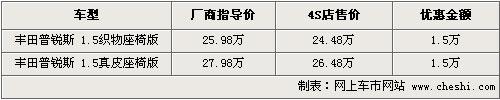 據(jù)4S店銷售人員介紹,目前普銳斯全系有兩款車在售,售價分別為25.98萬和27.98萬元,現(xiàn)在購車的話可以優(yōu)惠現(xiàn)金1.5萬元?钍胶皖伾惶R全,訂車的話周期比較長,需等大概2個月時間。