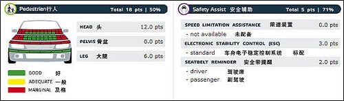 上圖描述的是車輛對于路人的保護(hù)情況和安全輔助設(shè)備配置情況。路人安全在歐洲已經(jīng)普遍重視,很多檢測項(xiàng)目已經(jīng)有了很清晰的標(biāo)準(zhǔn)。圖中看出,高爾夫6代翼子板部分對行人傷害是比較重的。在安全配置方面,高爾夫6代標(biāo)配了ESC,也就是我們國內(nèi)常說的ESP,不知道國產(chǎn)版本會不會“偷工減料”。駕駛席和副駕駛的安全帶提醒裝置都為高爾夫6代的最終成績做了加分。