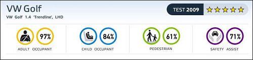 綜合來看,高爾夫6代獲歐洲碰撞測試實(shí)驗(yàn)室5星評價(jià)。對成員保護(hù)得分率97%,對兒童保護(hù)得分率84%,對行人保護(hù)得分率61%,安全輔助裝備得分率71%。