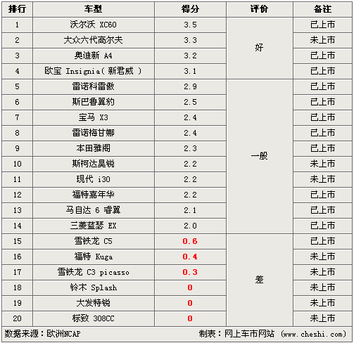 從上圖中的歐洲NCAP測試統(tǒng)計中可以看出,以安全著稱的沃爾沃確實有實力,XC60以3.5的高分位列第一名,緊隨其后的大眾新高爾夫和奧迪新A4,歐寶Insignia(即新君威)也獲得了3.1分,四款車都獲得了好的評價,其中除了新高爾夫即將國產(chǎn)之外,其他三款都已在國內(nèi)市場銷售。有好的就有差的,即將國產(chǎn)的雪鐵龍C5僅獲0.6分,而鈴木Splash、大發(fā)特銳、標(biāo)致308CC意外的評為零分,在碰撞中毫無保護(hù)可言甚至可能會對頸部造成危險,而鈴木Splash還將在昌河鈴木投產(chǎn),不知到時能否獲得改進(jìn)。