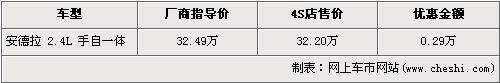 據(jù)4s店銷售人員介紹,目前歐寶安德拉現(xiàn)金優(yōu)惠2900元,在售的2.4L 手自一體車型售價經(jīng)優(yōu)惠后降為了32.20萬元。本車外觀共有白、乳白、黑、灰、銀、藍6種顏色,內(nèi)飾有黑、棕兩種顏色,總共12種顏色搭配供消費者選擇。銷售人員還介紹,店內(nèi)現(xiàn)車比較有限,以灰色和藍色為主,其他顏色需預訂。
