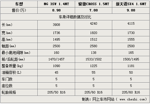 三款車的車體尺寸差距較明顯,不論外觀尺寸還是軸距均有所不同,駿捷的長/寬/高三項(xiàng)均明顯優(yōu)于名爵MG3與天語,而軸距方面也是駿捷CROSS更勝一籌,所以三車的內(nèi)部空間相比起來自然是剛剛上市的駿捷CROSS更寬大一些。其它方面如輪轂輪胎尺寸則相差不多,三車輪胎寬度均符合跨界車的多面性要求。