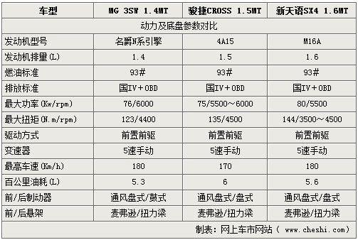 在動(dòng)力方面,三款車型的排量分別為1.6L,1.5L以及1.4L,在排量不同的基礎(chǔ)上,天語以及名爵MG3在功率輸出方面表現(xiàn)更佳,而駿捷CROSS則在扭矩的輸出方面表現(xiàn)的較為突出。最高車速方面三車相差僅10公里/每小時(shí),底盤的懸架設(shè)計(jì)也基本一致,但是駿捷CROSS的前后盤式制動(dòng)顯然要優(yōu)于MG3的前盤后鼓的制動(dòng)設(shè)計(jì),而排量更高的天語則凸顯了日系車的油耗優(yōu)勢(shì)。