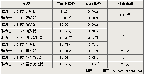 筆者從廣汽豐田北京地區(qū)經(jīng)銷商處了解到目前雅力士1.3排量和1.6排量均有現(xiàn)車供應(yīng),其中現(xiàn)金優(yōu)惠也各不相同。1.3排量兩款車優(yōu)惠5000元,1.6精致版優(yōu)惠1萬元,1.6自動至尊版和頂配至尊銳動版有一批搭載進(jìn)口發(fā)動機(jī)車型最高可優(yōu)惠現(xiàn)金2.5萬元。全系優(yōu)惠后最低售價(jià)為8.7萬元。目前有黑色、紅色、銀色等現(xiàn)車供應(yīng),部分車型仍需要預(yù)定。
