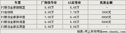 據(jù)比亞迪汽車4S店銷售人員表示,比亞迪F3本次降價的旗艦型和實用型都沒有車,而且無法接受預訂。不過標準型、豪華型和自動擋車型目前都有較大的優(yōu)惠幅度,其中豪華型和標準型分別可以優(yōu)惠6000元和5000元。而F3自動擋因為現(xiàn)車比較少,目前的優(yōu)惠幅度只有3000元。