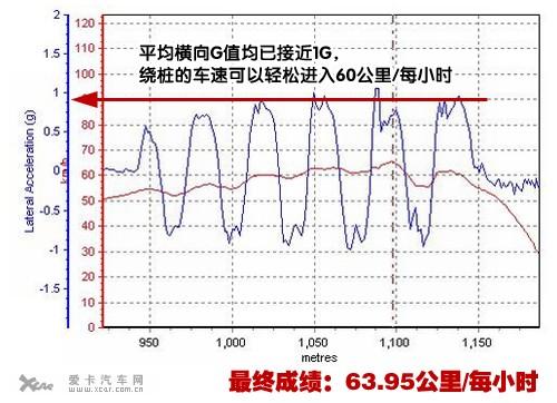 從曲線圖中我們可以看出,邁騰的平均橫向G值均已接近1G,繞樁的車速可以輕松進(jìn)入60公里/每小時,而最終63.95公里/每小時的18米繞樁成績,再次展現(xiàn)出大眾PQ46平臺的強(qiáng)大實力。