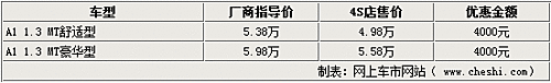 據(jù)銷(xiāo)售人員介紹,奇瑞A1目前可以優(yōu)惠4000元,但豪華型現(xiàn)車(chē)不足,部分顏色需要預(yù)訂。而且個(gè)別4S店的并沒(méi)有豪華型現(xiàn)車(chē),也需要預(yù)訂,訂金為2000元。