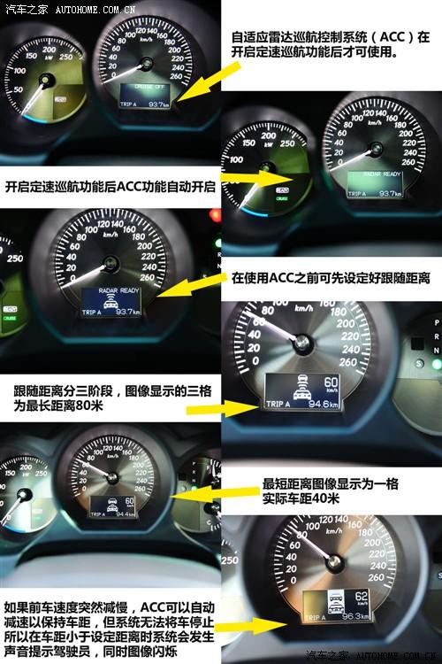 這款GS450h帶有自適應(yīng)雷達(dá)巡航控制系統(tǒng)(ACC),所謂自適應(yīng)就是根據(jù)駕駛員設(shè)定的距離值,電腦讓車輛始終保持在這個距離上。首先,要開啟這個功能需要先打開定速巡航開關(guān),這時(shí)儀表盤中央顯示屏上除了會出現(xiàn)巡航激活燈外,還有一個RADAR READY的字樣;此時(shí)可以對距離值進(jìn)行設(shè)定,距離值分為3級,圖像上顯示一格為最近,三格為最遠(yuǎn),距離值分別是40米、60米、80米。