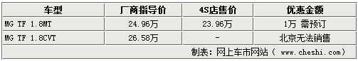 與比亞迪S8同為敞篷跑車設計的MG TF跑車在北京市場仍為訂單銷售狀態(tài)。網(wǎng)上車市網(wǎng)站由北京名爵經(jīng)銷商處了解到,現(xiàn)在購買名爵MG TF跑車,雖然在價格上有萬元的優(yōu)惠,但是各店均無現(xiàn)車,需要提前預訂,具體詳情如下: