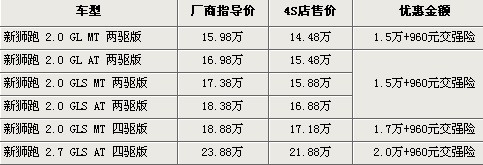 據(jù)4S店銷售人員介紹,目前購買獅跑可以贈送960元的交強險,同時有1.5萬-2萬元不等的現(xiàn)金優(yōu)惠。兩驅(qū)標準版優(yōu)惠后售價僅為14.48萬元。目前經(jīng)銷商處有黑色、銀色等現(xiàn)車供應(yīng),藍色等款需要預(yù)定,訂金為2千元,月內(nèi)便可以順利提車。