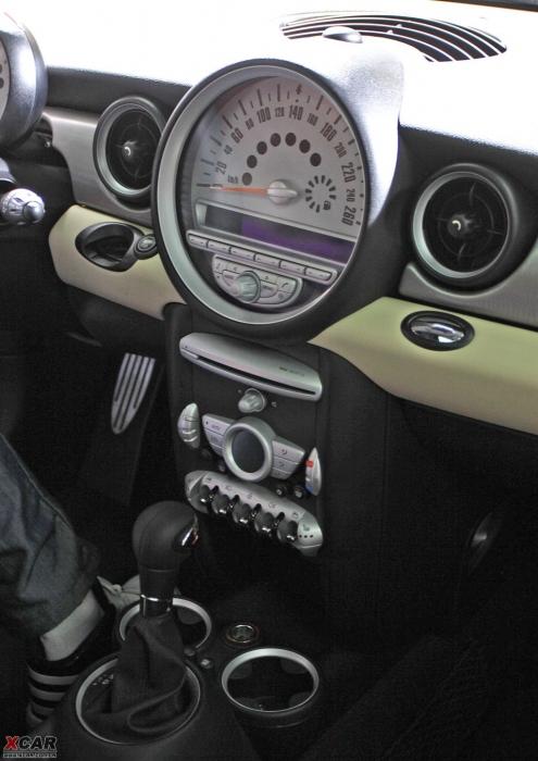 坐進(jìn)MINI的車內(nèi),一個(gè)圓形的白色大儀表盤非常惹眼,可電子顯示車速、油量、冷卻劑以及其他功能狀態(tài)等信息。這種布局自從1968年以來(lái)一直是MINI典型特征?刂婆_(tái)下方帶有6個(gè)條形小開關(guān)是從原創(chuàng)MINI繼承而來(lái)的,這些開關(guān)均為彈簧式按鈕,使用后自動(dòng)彈回原來(lái)狀態(tài)。