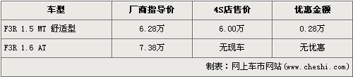 據(jù)比亞迪汽車北京地區(qū)4S店銷售人員介紹,目前北京在售的比亞迪F3R只有1.5L手動(dòng)舒適版車型,并且廠商指導(dǎo)價(jià)也從6.08萬元回升到了6.28萬元。目前購(gòu)買此車的消費(fèi)者可以得到2800元的優(yōu)惠,經(jīng)優(yōu)惠后售價(jià)降到了6萬元。
