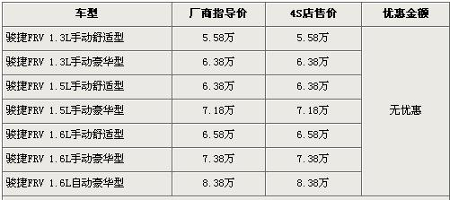 駿捷FRV是中華汽車首款兩廂車型,排量分為1.6L和1.3L,兩種排量車型分別在去年5月份和7月份上市。近期,駿捷FRV的車型再次得到了豐富,1.5L車型已經(jīng)進(jìn)入各家中華經(jīng)銷店并開始售賣,駿捷FRV全系的售價(jià)區(qū)間為5.58萬(wàn)元-8.38萬(wàn)元。根據(jù)我們價(jià)格系統(tǒng)監(jiān)測(cè)顯示,駿捷FRV全系取消了現(xiàn)金優(yōu)惠,具體詳情請(qǐng)看下表: