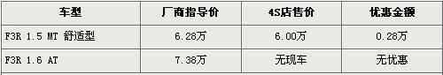 據(jù)比亞迪汽車北京地區(qū)4S店銷售人員介紹,目前北京在售的比亞迪F3R只有1.5L手動舒適版車型,并且廠商指導(dǎo)價也從6.08萬元回升到了6.28萬元。目前購買此車的消費者可以得到2800元的優(yōu)惠,經(jīng)優(yōu)惠后售價降到了6萬元。