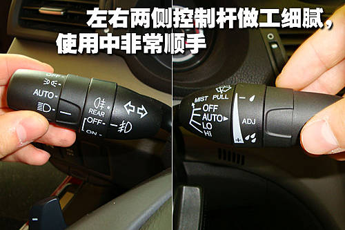 方向盤左右兩側控制桿為軟橡膠包裹手感細膩,無論是看、觸都能感覺到這部分材料的工藝質量很好。并且旋鈕設計能夠滿足手指粗大駕駛者的使用及調節(jié)。