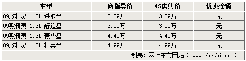 長城09款精靈目前在4S店內已經(jīng)有現(xiàn)車銷售,店內沒有的車型顏色需要預訂,訂金2000元,等一周即可提車。09款精靈基于老款車型下調了原廠商指導價,指導價相比老款車型降幅達4000元,但09款精靈現(xiàn)車目前在4S店內還沒有任何優(yōu)惠。