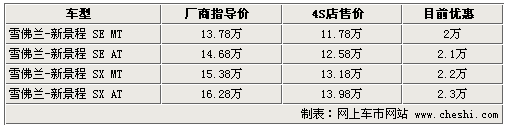 據(jù)4S店銷售人眼介紹:目前新景程現(xiàn)車非常充足,顏色也較為齊全,。目前優(yōu)惠幅度最高可達(dá)2.3萬元,最少也在2萬元。最低配置車型已經(jīng)下降至11.78萬元。