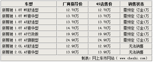 經(jīng)銷商透露,現(xiàn)在各店內(nèi)的新尊馳基本為展車或已被客戶預(yù)訂的車輛,基本沒有現(xiàn)車可以滿足消費(fèi)者的需要,消費(fèi)者如需購買可以繳納1萬元訂金后等待20天左右即可提車。由于新尊馳為剛剛上市的新車,所以沒有任何形式的優(yōu)惠。同時(shí)銷售人員還說明,2.0L的新尊馳由于尚未大量投產(chǎn),故暫時(shí)無法銷售,請(qǐng)消費(fèi)者諒解。