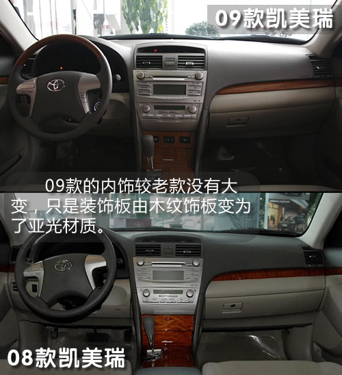 與外形只是細節(jié)小改相同,09款凱美瑞的內(nèi)飾也沒有給我們帶來太多新意。大面積的亞光飾板取代了原先的木紋裝飾,顯得更有檔次——避免再被人指責(zé)為塑料感強烈的尷尬。