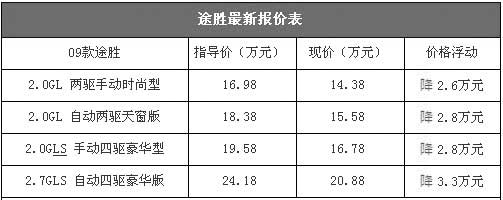 09款途勝上市后銷量一直都不錯(cuò),8月份售出了4331輛,在國內(nèi)SUV銷量榜中排在第五位,比同價(jià)位競爭對手獅跑和逍客高出不少。昨日,我們從北京地區(qū)的一家北京現(xiàn)代汽車綜合經(jīng)銷商處了解到,近期09款途勝的價(jià)格已經(jīng)趨于穩(wěn)定,最高可優(yōu)惠3.3萬元。以下是09款途勝最新報(bào)價(jià)表: