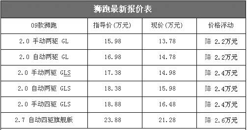 09款獅跑上市后,價(jià)格迅速下降,因此月銷(xiāo)量能夠穩(wěn)定在4000輛左右。我們昨日從北京地區(qū)一家東風(fēng)悅達(dá)起亞獅跑經(jīng)銷(xiāo)商處了解到,近期獅跑部分車(chē)型的優(yōu)惠再次增加2000元,最高降幅已經(jīng)增至2.4萬(wàn)元,性?xún)r(jià)比再次提升。目前獅跑最低配車(chē)型2.0手動(dòng)兩驅(qū)舒適版的售價(jià)為13.78萬(wàn)元,和歷史最低價(jià)持平,和競(jìng)爭(zhēng)對(duì)手途勝售價(jià)非常接近。以下是09款獅跑最新詳細(xì)報(bào)價(jià)表: