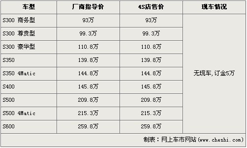 據(jù)北京奔馳4S店銷售人員介紹,奔馳新一代S級共有9個車型,售價區(qū)間為93萬元-25.8萬元。前端時間到店的奔馳新S級S350L已經(jīng)全部售出,目前店內(nèi)全系無現(xiàn)車。欲購買的消費者需交訂金5萬元,最早下個月可提車。
