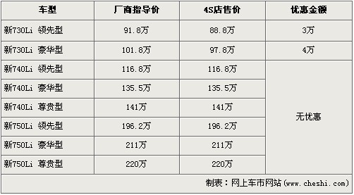 據(jù)北京寶馬經(jīng)銷店銷售人員介紹,寶馬新7系共分為730Li、740Li、750Li三種等級車型,售價區(qū)間為91.8萬元-220萬元。目前購買新730Li領(lǐng)先型的消費者可以得到3萬元的優(yōu)惠,新730Li豪華版車型可以優(yōu)惠4萬元。消費者還介紹,除了新730Li有現(xiàn)車外,其余車型均需預訂,訂金是10萬元,最早12月份可提車。