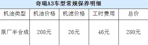 或許有人會想,采用自主研發(fā)發(fā)動機的奇瑞A3車型的保養(yǎng)費用上應該比較便宜吧!其實不然,由于奇瑞4S店為奇瑞A3車型標配的是美孚速霸1000半合成機油,因此材料費比較高,計算下來更換機油機濾總共需要花280元左右。而奇瑞A3享受兩次的免費保養(yǎng)檢測,第一次為2000公里時的免費檢測以及油液補充,第二次是5000公里的機油機濾的更換。