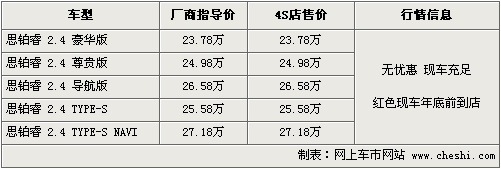 據(jù)東風(fēng)本田4S店銷售人員介紹,目前思鉑睿全系車型無優(yōu)惠,現(xiàn)車比較充足,現(xiàn)車顏色以白色、銀色、藍(lán)色為主。思鉑睿全系提供了塔夫綢白、彩晶黑、鈦金銀、炫影藍(lán)、炫動紫五種外觀顏色,以及靜雅黃、靜逸黑兩種內(nèi)飾顏色供消費(fèi)者選擇。TYPE-S車型還推出炫速紅專用色,在年底前現(xiàn)車將會到店。北京地區(qū)各4S店由于訂單不同,各店銷售的現(xiàn)車顏色有所不同。