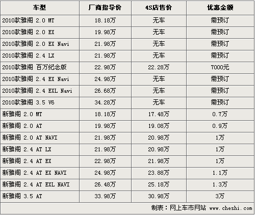據(jù)4S店銷售人員介紹,目前部分2010款百萬紀念版雅閣新車已經(jīng)到店,消費者購車的話可以優(yōu)惠7000元。其他款車型還需要預(yù)訂,訂金為2000元,F(xiàn)在店內(nèi)08款車型最高可優(yōu)惠現(xiàn)金3萬元,入門級車型優(yōu)惠現(xiàn)金7000元,以2.0手動檔為例,優(yōu)惠后僅首17.49萬,F(xiàn)在店內(nèi)有黑色、銀色等可供消費者選擇。