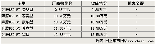 據(jù)一汽奔騰4S店銷售人員介紹,奔騰B50目前的銷售情況非常好,但現(xiàn)在所有車型顏色均不是很全,部分顏色仍需要預(yù)訂。消費(fèi)者如果預(yù)訂奔騰B50,需要交付1000元訂金,而且B50自上市起到現(xiàn)在一直沒(méi)有任何優(yōu)惠活動(dòng)。而3G版車型則一直處于無(wú)車的狀態(tài),還請(qǐng)消費(fèi)者諒解。