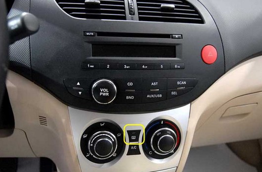 凌傲的后視鏡加熱功能屬于中高配車型才有,也就是非標配的功能。位置在空調出風口選擇旋鈕以及溫度旋鈕中間,也就是A/C開關之上。開關很容易的。伸手可觸。