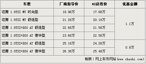 據(jù)北京一汽大眾經(jīng)銷店銷售人員介紹,邁騰全系車型全系優(yōu)惠1.1萬元。經(jīng)1.1萬元的優(yōu)惠后,全系入門級的1.8TSI MT時尚型的售價從18.98萬元下降到了17.88萬元。全系最高配的邁騰2.0TSI豪華版經(jīng)9000元優(yōu)惠后,售價降到了25.48萬元。銷售人員還介紹,目前邁騰全系現(xiàn)車都比較充足。