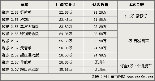 據(jù)一汽豐田4S店銷售人員介紹,目前銳志可優(yōu)惠1.6萬(wàn)元,現(xiàn)車比較齊全,一般購(gòu)買車型主要集中在舒適版和紀(jì)念版,消費(fèi)者可根據(jù)需要選購(gòu)。另?yè)?jù)介紹,新銳志車型要在明年4月北京車展亮相,之后2個(gè)月左右才可以購(gòu)買到,并且新款車型剛上市不會(huì)有現(xiàn)款這么大的優(yōu)惠空間,目前購(gòu)買現(xiàn)款銳志也是一個(gè)不錯(cuò)的選擇。如消費(fèi)者有意購(gòu)買,到店詳談會(huì)有更優(yōu)惠的價(jià)格。北京地區(qū)各4S店由于訂單不同,各店銷售的現(xiàn)車顏色有所不同。