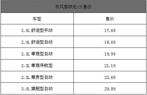 2009年11月23日,在第七屆中國(guó)國(guó)際汽車博覽會(huì)上,備受矚目的09年B級(jí)車市壓軸之作,東風(fēng)雪鐵龍品牌戰(zhàn)略旗艦車型C5正式公布價(jià)格。東風(fēng)雪鐵龍C5共有2.0L、2.3L和3.0L三種排量,四種級(jí)別可供選擇,其價(jià)格區(qū)間為17.69萬(wàn)-29.89萬(wàn)元。從即日起,全國(guó)各指定銷售網(wǎng)點(diǎn)開(kāi)始接受預(yù)訂,首批展車也將陸續(xù)到店,并于2010年1月初正式交付。