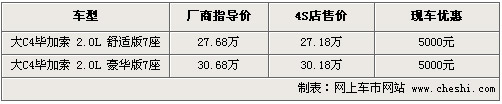 據(jù)4S店銷售人員介紹,目前C4大畢加索現(xiàn)車可優(yōu)惠現(xiàn)金5000元, 全系車型有舒適版和豪華版兩款車型,售價分別為27.68萬和30.68萬。目前現(xiàn)車供貨比較充足,現(xiàn)車顏色也比較齊全。