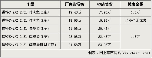 據(jù)北京福特4S店銷售人員介紹,店內(nèi)在售的福特S-MAX有1.5萬元的現(xiàn)金優(yōu)惠,并且7座的時(shí)尚版車型已經(jīng)停產(chǎn)。經(jīng)1.5萬元優(yōu)惠后,2.3L豪華版、旗艦版、旗艦導(dǎo)航版的售價(jià)分別降為了20.48萬元、22.48萬元和23.08萬元,入門級的5座時(shí)尚型售價(jià)降到了17.98萬元。