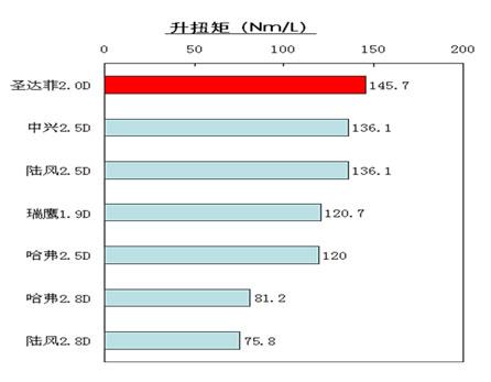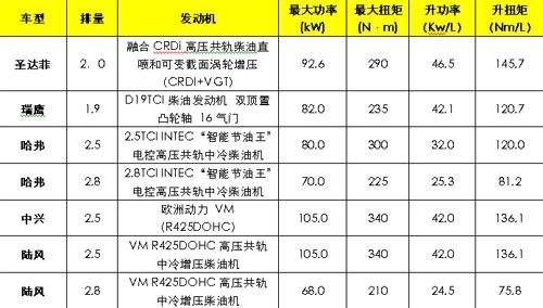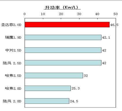 通過發(fā)動機的對比(上表),我們不難發(fā)現(xiàn),在發(fā)動機的功率和扭矩方面中興和陸風(fēng)略勝一籌,然而在真正反映發(fā)動機動力技術(shù)水平的指標(biāo)——升功率上,排量較小的圣達(dá)菲2.0T則領(lǐng)先排名第二的瑞鷹10.5。